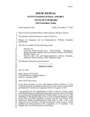 Journal of the House of Representatives State of Colorado: Fifty-ninth General Assembly First Extraordinary Session at Denver, the State Capitol