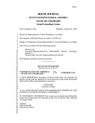 Journal of the House of Representatives State of Colorado: Fifty-eighth General Assembly First Extraordinary Session at Denver, the State Capitol